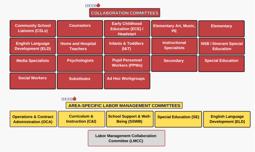 MCEA Labor Management Committees (LMCs), Collaboration Committees (CCs), and Ad Hoc contractual workgroups meet jointly with MCPS representatives to engage in collaborative problem solving on matters related to curriculum, instruction, student services, and educator working conditions. Committees provide a structured space for educators to raise concerns, share insights, and influence decisions that affect their work and students.